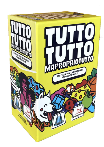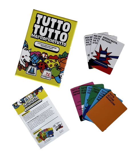 In Tutto Tutto Ma Proprio Tutto, tu e i tuoi amici a turno dovrete indicare cose appartenenti a categorie come “ film sui dinosauri” o “marchi di prodotti per l’igiene”. Se non lo sai fare, puoi giocare carte per cambiare categoria o raccogliere le carte in gioco come penalità.